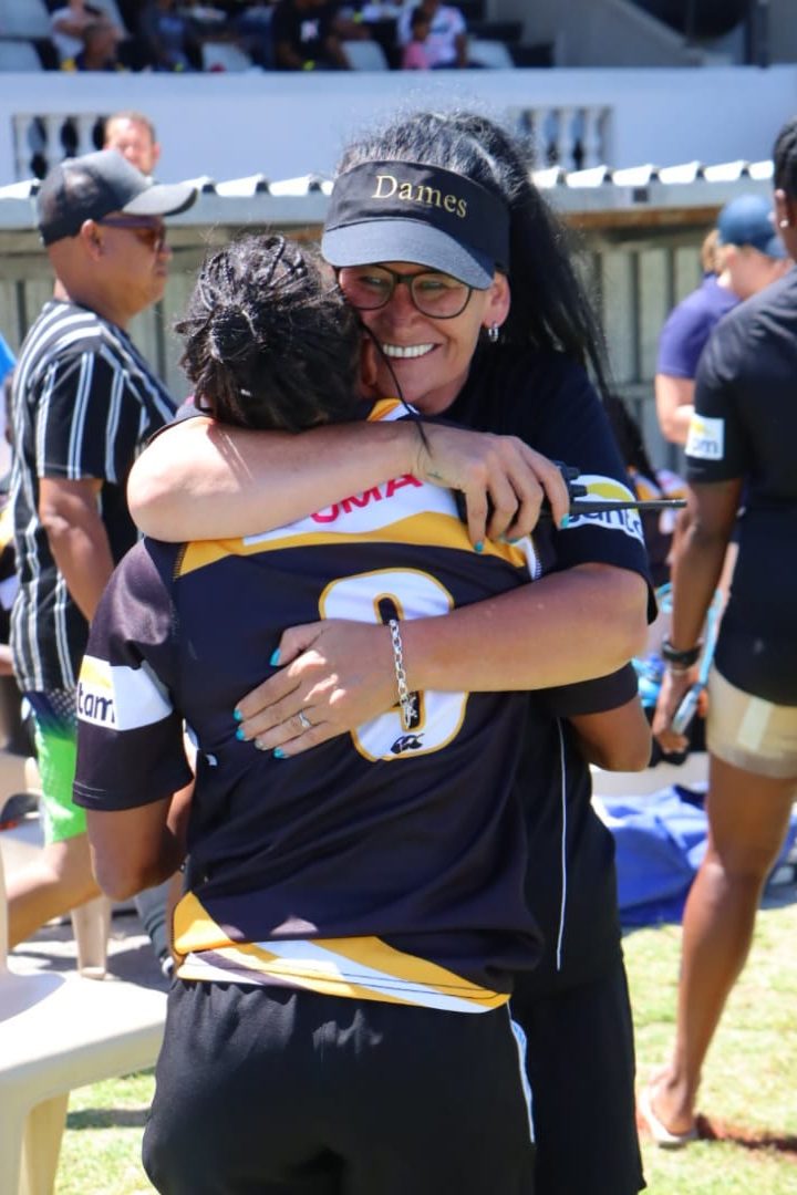 Photo: Michelle Bosch embraces Sanlam Boland Dames scrumhalf, Felicia Jacobs, during the 2025 SA Women’s Premier Division competition. Photo by Ernest Kilowan.